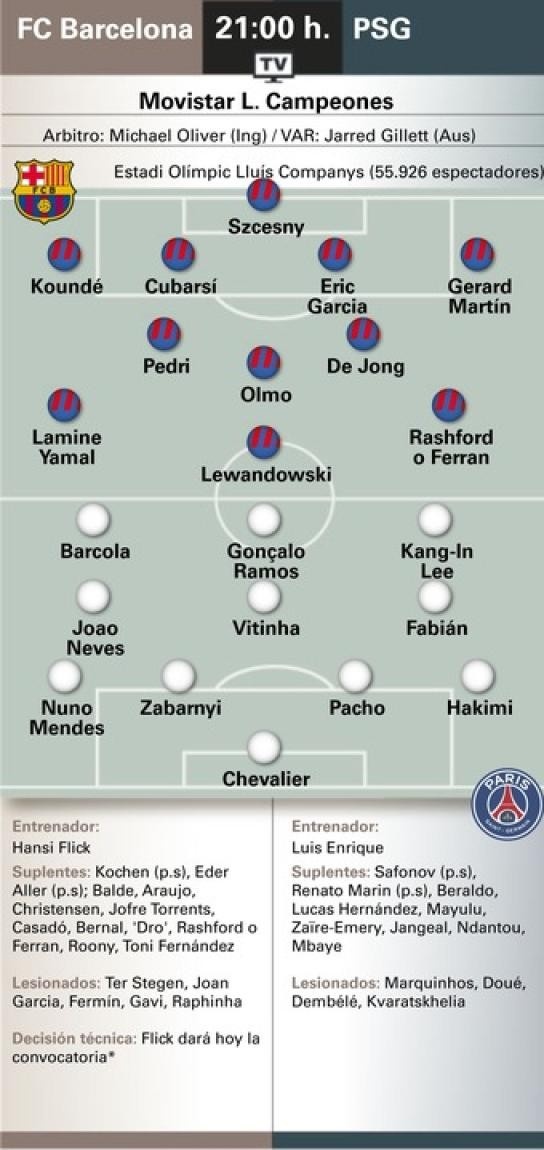 關於首發陣容的猜測,除了萊萬多夫斯基或費蘭-托雷斯其中一人會登場外,後防的位置上尤為引人關註。庫巴西與埃裏克-加西亞都是熱門人選,除非阿勞霍有望重回首發。世體為巴薩與巴黎的首發陣容作出了如下預測: