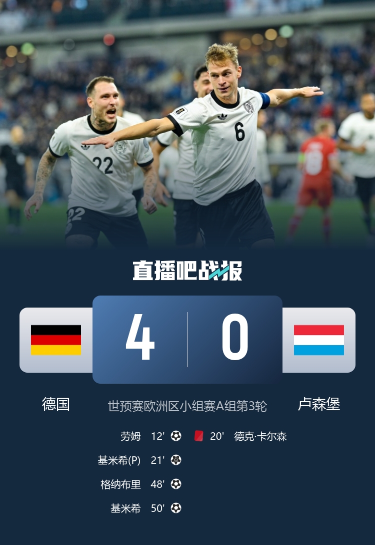 在北京時間10月11日淩晨2:45進行的歐洲區世預賽小組賽中,德國隊在伊杜納信號公園球場以4-0輕取盧森堡,展現出強大的比賽控制力和高效的進攻能力。